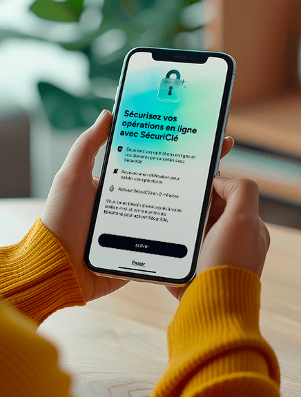 Sofinco a conçu SécuriClé, que je peux retrouver directement dans mon app Sofinco. SécuriClé me sert à renforcer la sécurité de mes paiements grâce à une identification par mot de passe. Je pourrais également m’en servir pour sécuriser mes changements de coordonnées personnelles ou bancaires (2)(Note de bas de page).