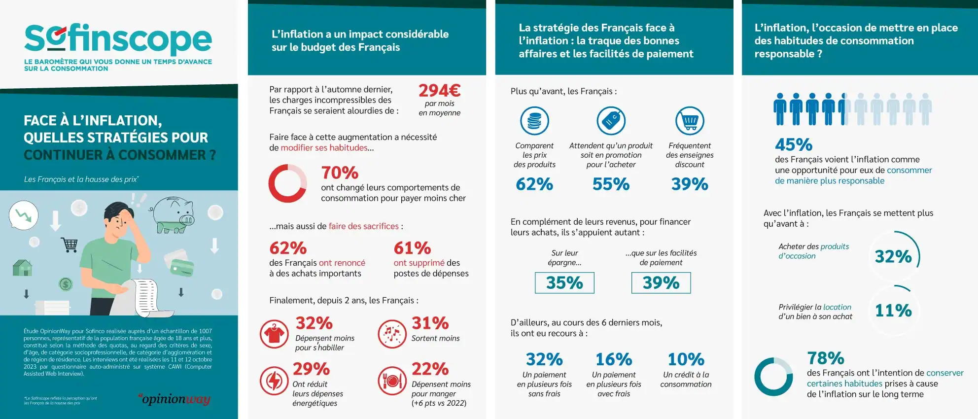- Dans ce contexte difficile, les Français ont dû adapter leur consommation. D’une part, ils ont modifié leurs habitudes. 70% des Français ont changé leurs comportements de consommation pour payer moins cher, sans supprimer de postes de dépenses. Mais d’autre part, une proportion non-négligeable de Français a dû consentir à faire des sacrifices pour pallier la hausse des prix. Six Français sur dix ont renoncé à des achats importants (62%) ou supprimé des postes de dépense (61%) parce qu’ils n’en avaient plus les moyens.