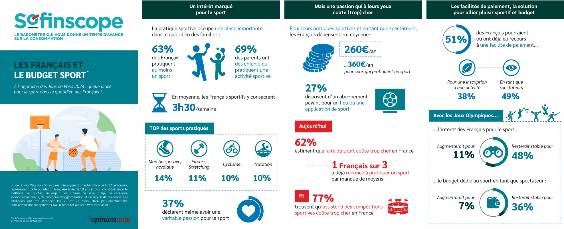 - Ces solutions financières pourraient notamment être utiles, avec l’arrivée des JO qui sont l’occasion de consommer davantage de sport. L’évènement sportif renforcerait l’intérêt des Français pour le sport (11% prévoient qu’il augmentera), et de ce fait engendrerait pour certains une hausse de leur budget pour le sport en tant que spectateurs (7%) mais aussi de leur envie de s’initier à de nouvelles activités sportives (7%).