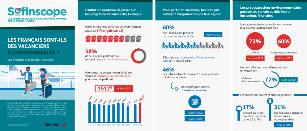 - Les facilités de paiement (crédit, paiement en plusieurs fois, paiement différé, etc.) sont une opportunité pour les Français de répondre à leurs désirs de vacances, tout en en allégeant les contraintes financières et/ou en tentant les vacances écoresponsables. La possibilité d’y avoir recours encouragerait 17% de ceux qui n’ont pas prévu de partir cet été à le faire et 31% des Français à organiser des vacances écoresponsables (-8 pts vs 2022).