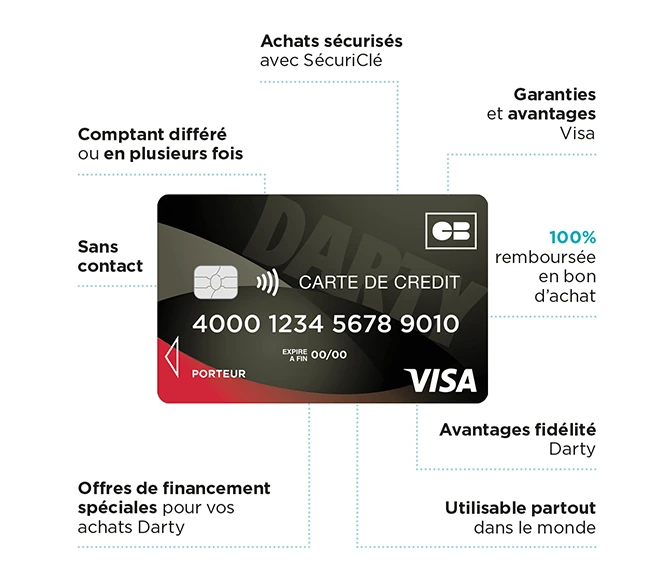 Avec la carte Visa Darty(1)(Note de bas de page), vous avez la possibilité de pouvoir payer tous vos achats au comptant ou en plusieurs fois dans tous les magasins Fnac/Darty, dans n’importe quelle enseigne ou sur internet, tout en cumulant des bons achats. Que ce soit pour vos dépenses du quotidien ou vos coups de cœur, c’est une carte pratique et récompensante dès le 1 er achat. Vous profitez d’un concentré d’avantages !