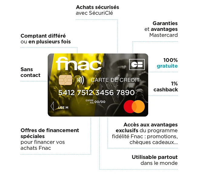 - 1% de cashback(6)(Note de bas de page) du montant des achats réalisés avec la carte est crédité sur votre compte fidélité sous réserve d'adhésion au programme Fnac+